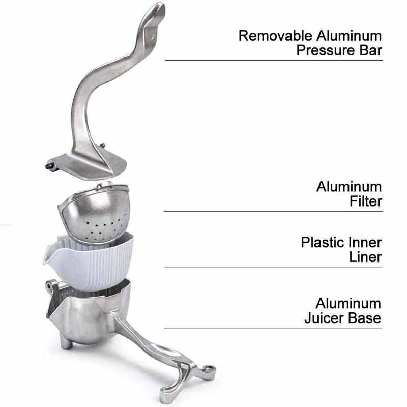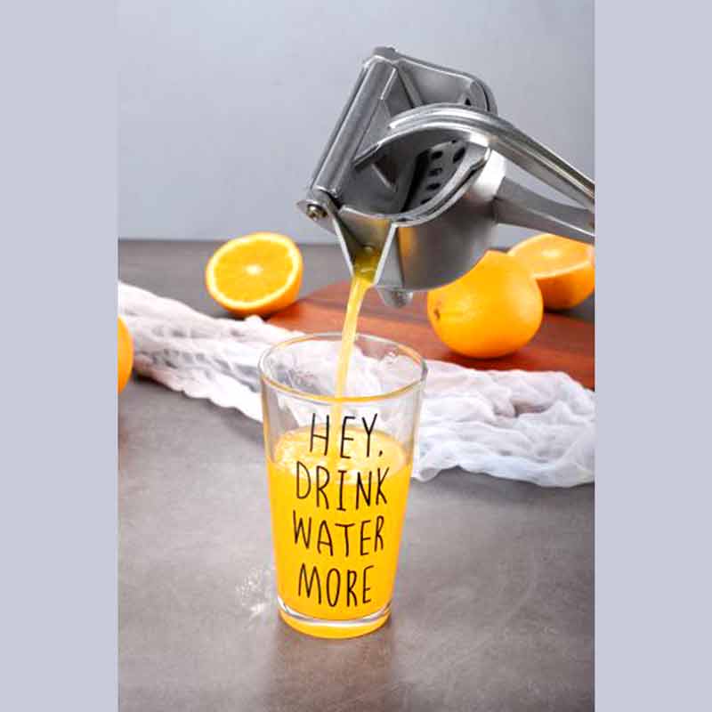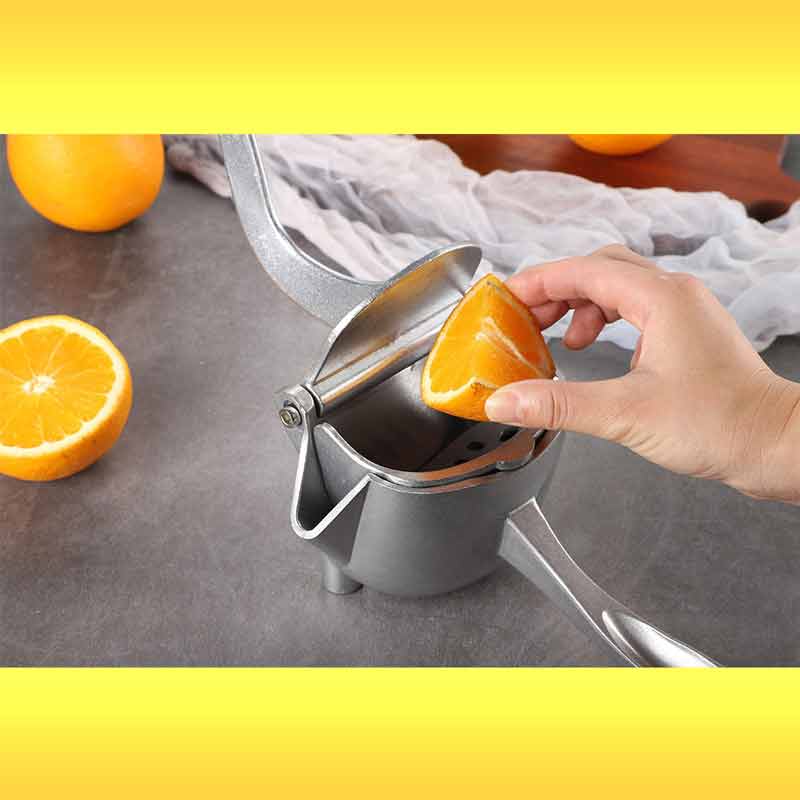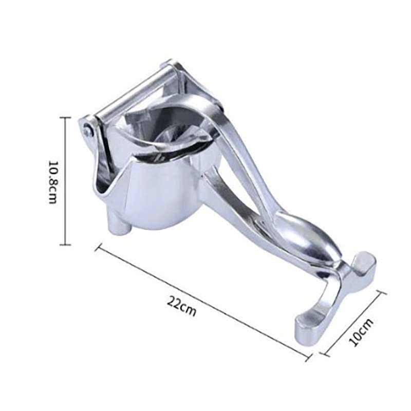 Aluminium squeezer juicer this juicer is made up of aluminum alloy and its hand press has high stiffness and firmness with the extra feature of ease and harmless size this lemon juicer 39 s user friendly size makes it feasible to place it anywhere in the kitchen so can use whenever you desire ergonomic design the manual fruit juicer 39 s handle is ergonomically designed to make it comfortable to hold which is strong and does not bend easy to use clean the orange squeezer is easy to clean just rinse with water and dry fruit juicer is so convenient to use with an effortless squeeze which will help you to relish each drop of your fruit juice applications multifunctional hand juicer is suitable for homes restaurants hotels bars milk tea shops and many more it will quench your thirst as and when you desire product specifications material aluminium alloy dimensions 21x10x8 cm weight 720 gm operating type hand press product description have got tired off for looking juice vendors around you a