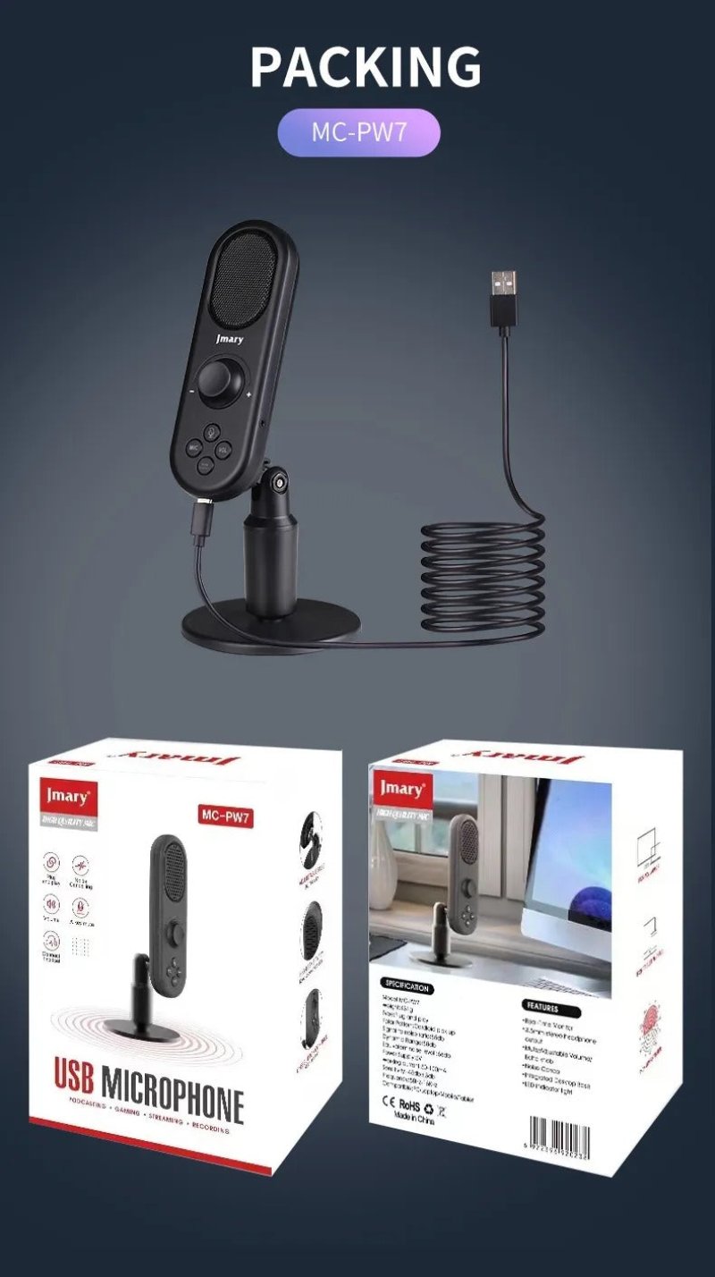 The **Jmary MC-PW7 Professional USB Microphone** is designed for high-quality audio recording, perfect for podcasting, streaming, and voiceovers. With a sleek and modern design, it features a cardioid pickup pattern that effectively captures sound while minimizing background noise. The USB connectivity ensures easy plug-and-play setup with computers and compatible devices. Its adjustable stand allows for flexible positioning, while the durable construction ensures longevity. With excellent sound clarity and user-friendly functionality, the MC-PW7 is an ideal choice for both beginners and professionals seeking reliable audio performance.