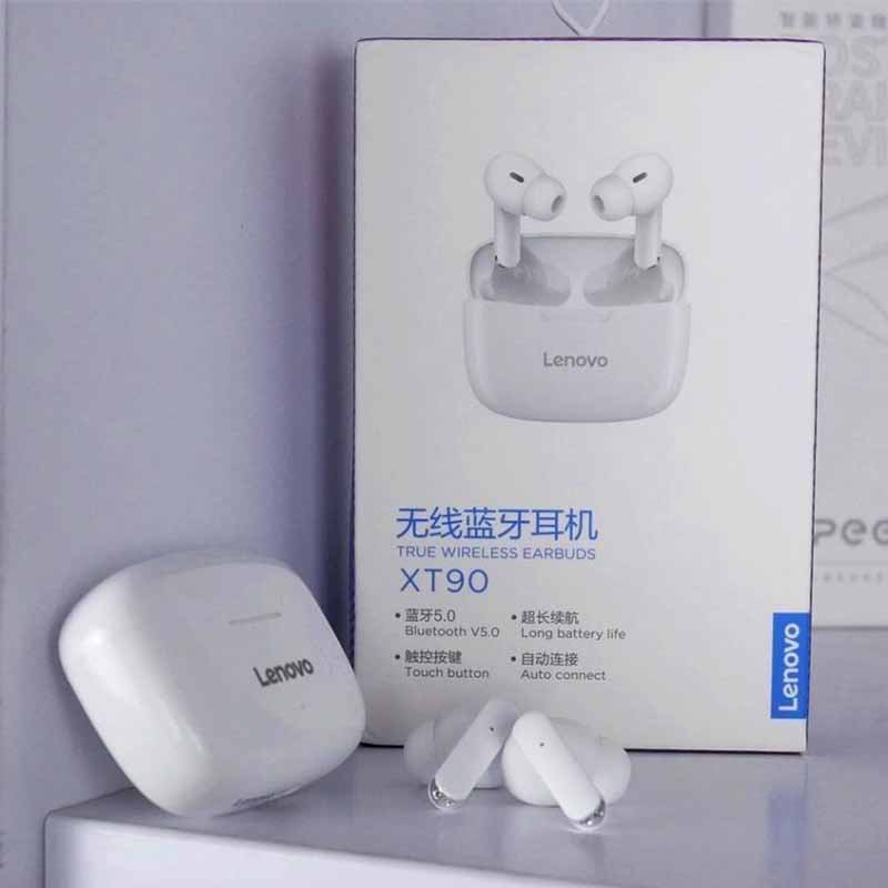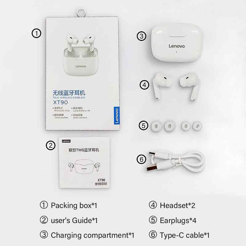 salepoint presents lenovo xt90 true wireless earbuds 5 0v original lenovo xt90 is a wireless bluetooth earbud that comes with various interesting features like low power consumption fast connection lower gameplay delay high speed transmission efficiency picture synchronization and clear audio along with bluetooth 5 0 chip it has a 13mm dynamic speaker to allow you to enjoy surrounding 3d music moreover it adopts an excellent dual processing chip with the use of which both earphones can be connected right after the mobile phone transmits the signal in addition lenovo xt90 has long lasting battery life with a large capacity charging box specification bluetooth version v5 0 supported profiles hsp hfp a2dp avrcp support audio decoding aac transmission distance 33 feet 10m frequency response 20 20khz battery capacity earbud 35mah 2 charging box 300mah charging time h 1h music time 2 3h standby time h 300h interface type c waterproof ip54 package includes 1 lenovo xt90 tws bluetooth 5 0 e