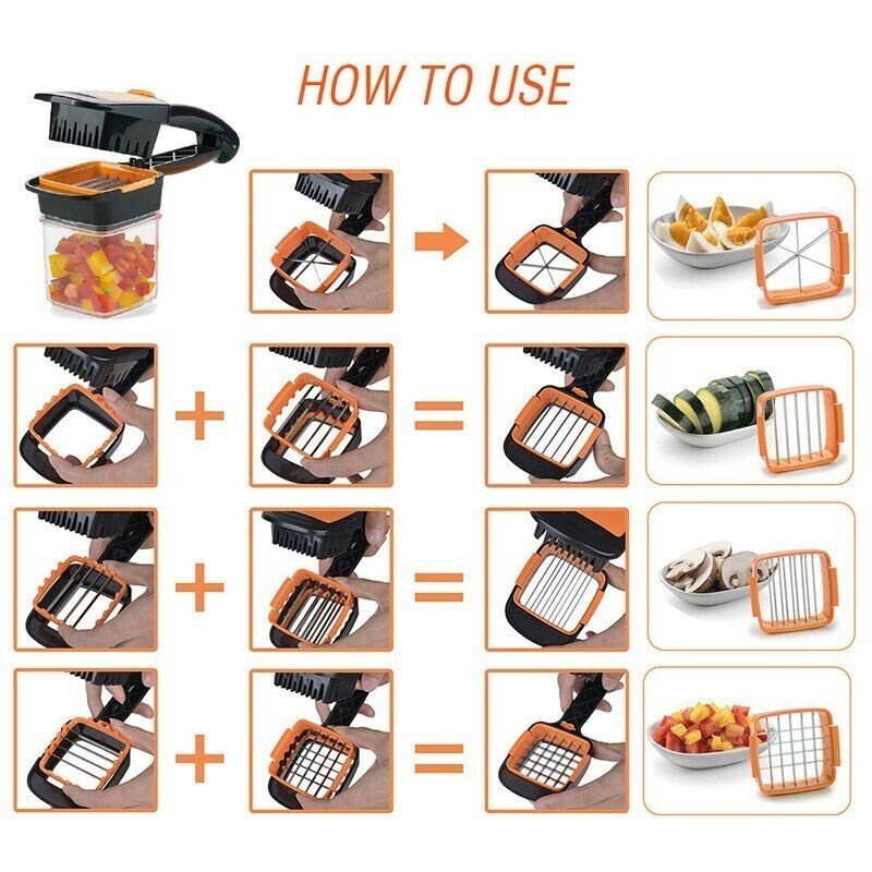 To resolve at typical times in the kitchenette chopping potatoes boring inefficient to apply a lot of period on the root vegetable the new nicer dicer 5 in 1 fruit vegetable chopper is such a fast and expedient kitchen tool makes you more easy and expedient in the bakery can cut fruits vegetables save your time operated with one hand can split into thick slices thin slices cubes pins and sixth fair put your ingredients in press down and attain perfect cutting consequences in a matter of seconds extra sharp stainless steel blades can split soft or hard foods such as curettes tomatoes mushrooms eggs lemons etc package include nicer dicer quick x 1 blade insert x 4 blind frame x 1 collecting container capacity 200 ml x 1 fresh keeping lid x 1 garlic cutter g5 x 1