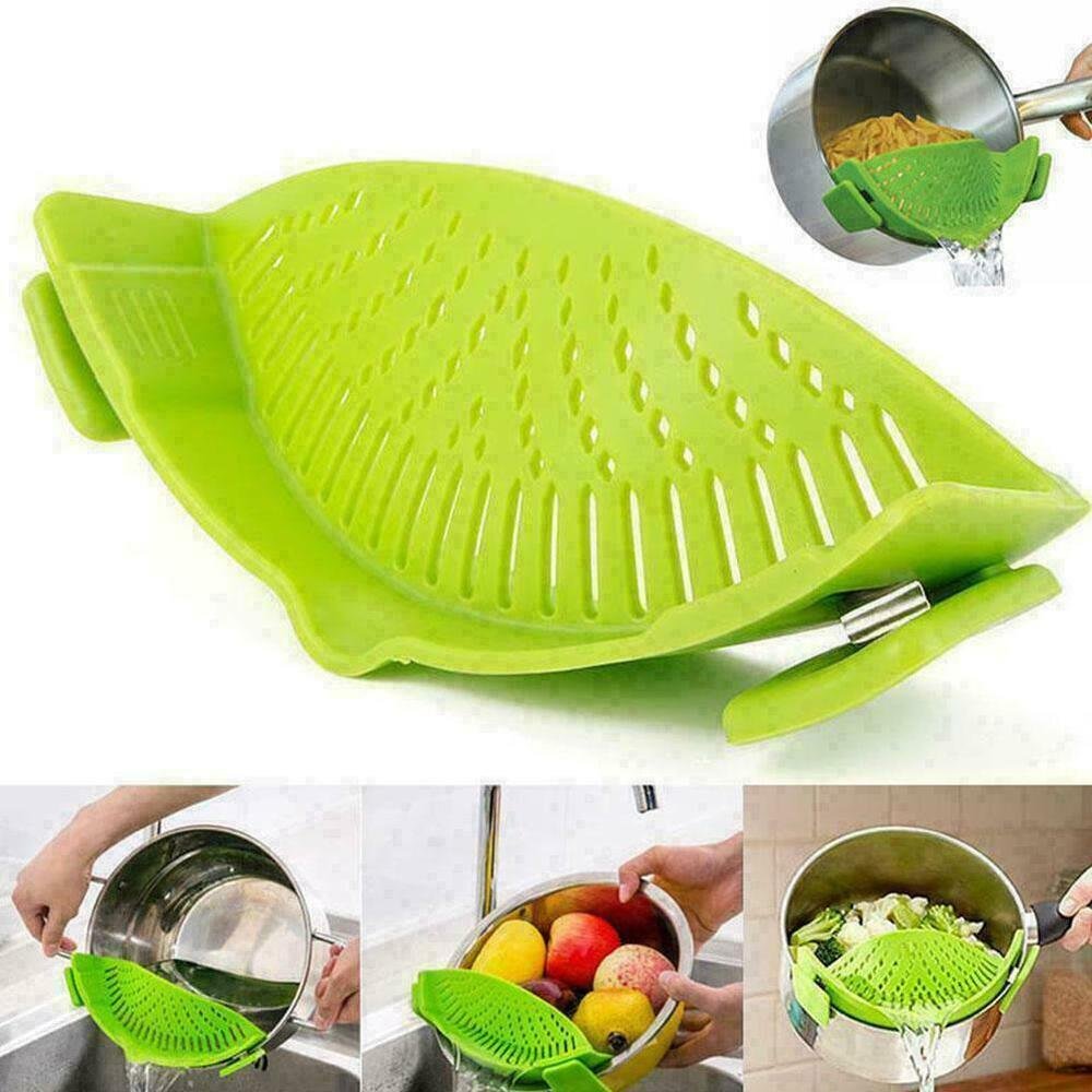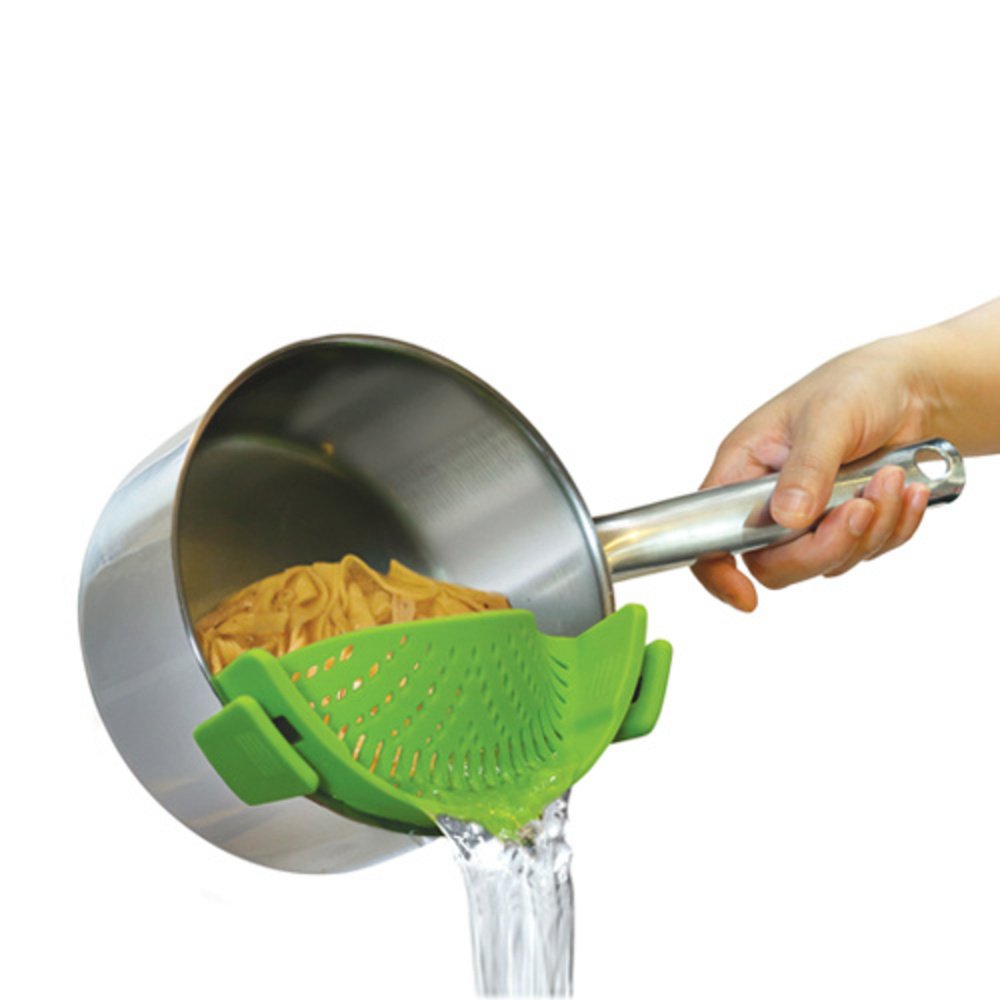 Quantifiable is silicone the size is approx 22 x 8 x 5 8cm bowl gasket safe it is wonderful dense for storage the pot strainer is elastic adequate to fitting onto closely all pots pans and dishes advanced worldwide design this pan filter will take the strain out of draining it breaks on gracefully with two clips the clips 39 sturdy grip will keep it securely devoted while in usage and can be left devoted to the pot while cookery superb quality heat resilient silicone filter is the latest most applied way to get your food strained thoroughly avoiding moving the food out of the pot the pot can be tilted over a bowl the liquids will be decanted out while the food leftovers in the container even with heftier diets like vegetables package include pan strainer x 1 other item not include