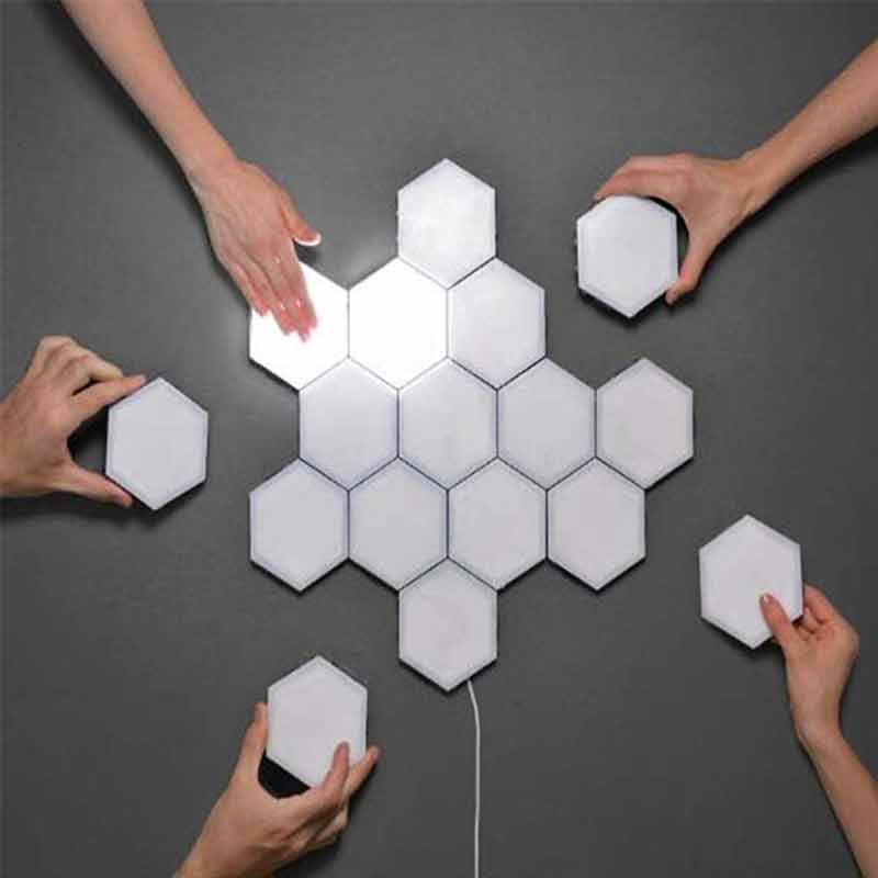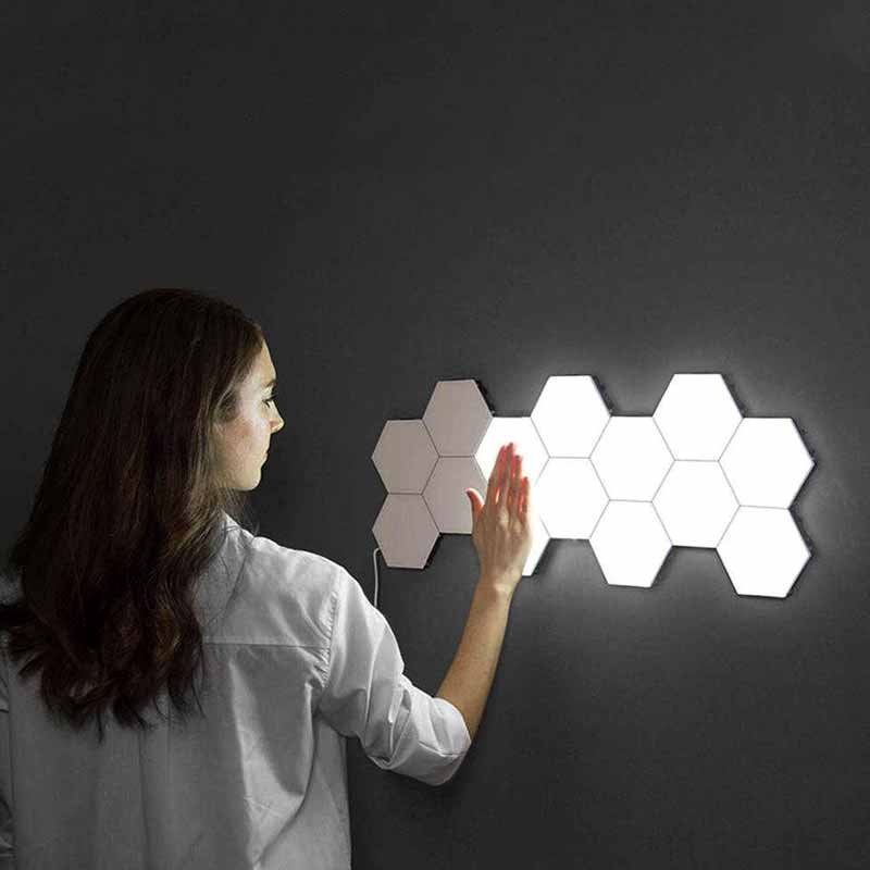 salepoint brings quantum led lamp segmental touch sensitive lighting hexagonal magnetic creative decoration wall lamp this is a quantum led lamp wall light with a hexagonal design using hexagonal design you can illuminate along with the different decoration designs for your home office or anywhere and make any arrangement to suit your needs physical touch to the quantum lamps can illuminate the light and make the modular and hexagonal design more beautiful by human physical touch the wall light is turned on and off when your body touches the surface the capacitive sensor used act as a switch that turns each segment on or off this design allows you to effectively slide where they want or need light using the product 39 s power supply each component is turned on and off with a capacitive touch sensor customize your own space by joining each segment by magnetic edges make your own design on your walls and change them accordingly using magnetic edges to connect the lights together to ma
