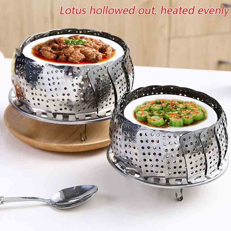 Premium 100 stainless steel rust free and long lasting special instruction handle ring for fork keeps hands away from steam the removable solid center loop let it more easy to clean and safe fully collapsible with 1 inch legs easy to store using perfect for use with a pressure cooker or pots with 8 inch in diameter and up it can be used as the vegetable steamer fruit plater steamed fish steamed buns dumplings etc cleaning method you had better use the warm water or soap weak detergent to clean please avoid using the bleach ingredients and abrasive solution steel ball grinding tools etc explore our more kitchen accessories