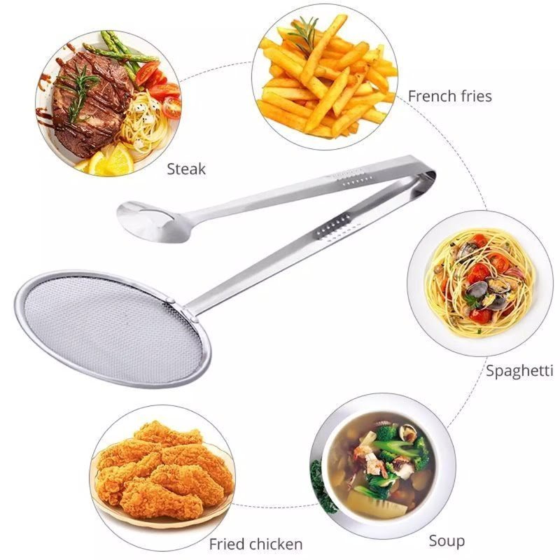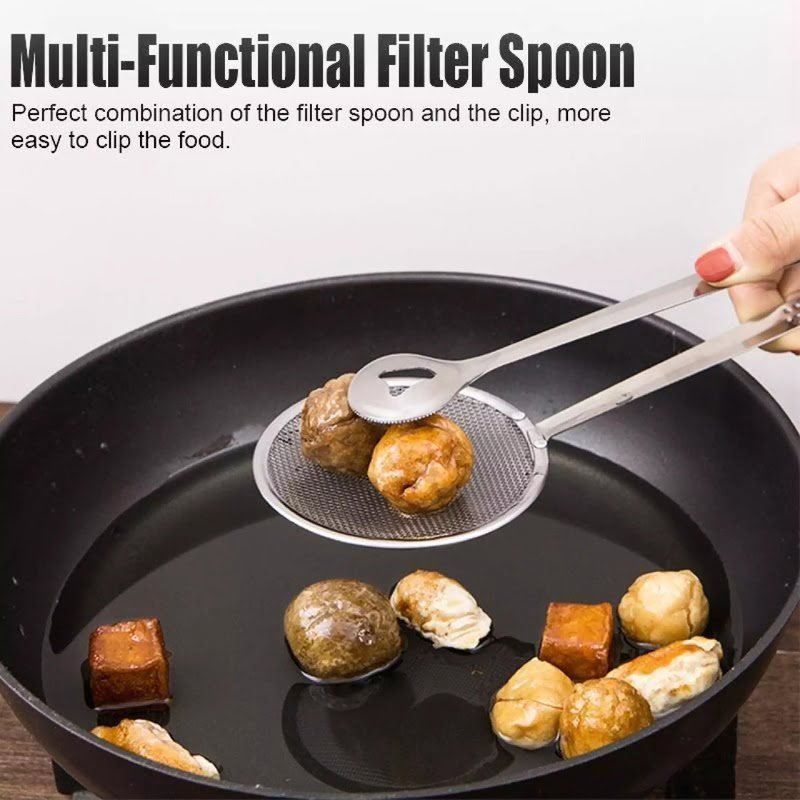 Stainless steel not easy to rust long term use with filter convenient take out fried foods multi functional filter spoon with clip ideal for salads barbecue cooking etc delicate hollow design package include stainless steel kitchen serving tongs x 1 buy with confidence click on order now if it has quality problems we will also refund unconditionally if you have any questions or concerns please feel free to contact 24 7