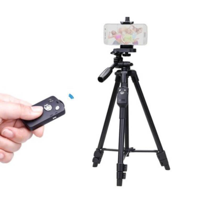 Tripod with bluetooth remote control shutter for mobile phones dslr and sports cameras tripods are one of the tools for imaging and photography yunteng vct 5208 is a unique type of tripod used for all kinds of photography including mobile photography it includes a smartphone holder a bluetooth remote shutter that can be used to trigger smartphone camera shutter this product is compatible with ios and android operating systems this tripod weighs of 600g and is rotatable by 360 it has universal size screw that can be used to attached any cameras to the tripod